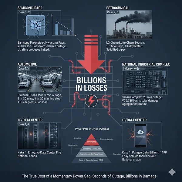 전력 계통 사고 대응을 위한 무정전 기술 분석 및 도입 전력 계통 사고 대응을 위한 무정전 기술 분석 및 도입 1. 전력 품질 저하의 핵심: 순간전압강하(Voltage Sag) 분석 산업 공정에서 가장 빈번하게 발생하는 문제는 '완전 정전'보다 '순간정전/전압강하'입니다. 현상 파악: 낙뢰, 단락 사고 또는 계통 내 대용량 부하의 스위칭으로 인해 전압 실효치가 0.1~0.9[pu] 범위로 0.5 cycle~1초간 급격히 하락하는 현상입니다. 리스크 요인: 10 cycle(약 0.16초) 미만의 극히 짧은 변동임에도 불구하고, 전압 크기가 60% 이상 저하될 경우 정밀 제어 기기 및 IT 설비의 오작동을 유발하는 치명적인 원인이 됩니다. 주는 300ms ~ 500ms 이내로 발생합니다.