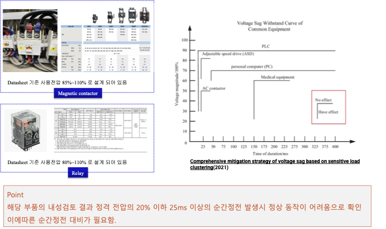 이러한 정지는 생산 설비의 공정 중단, 제품 불량, 설비 손상, 안전 문제로 이어질 수 있다. 특히 전원 복구 시 여러 모터가 동시에 기동되면 돌입전류가 급증하여 차단기 트립, 전압 강하, 추가 설비 정지를 유발할 가능성이 높다. 따라서 MCC Panel에서는 순간정전에 대한 MC 릴레이의 내성을 검토하는 것이 중요하며, 어느 정도의 정전 시간까지 릴레이가 유지되는지, 복전 후 제어 신호와 실제 동작이 일치하는지를 확인해야 한다.